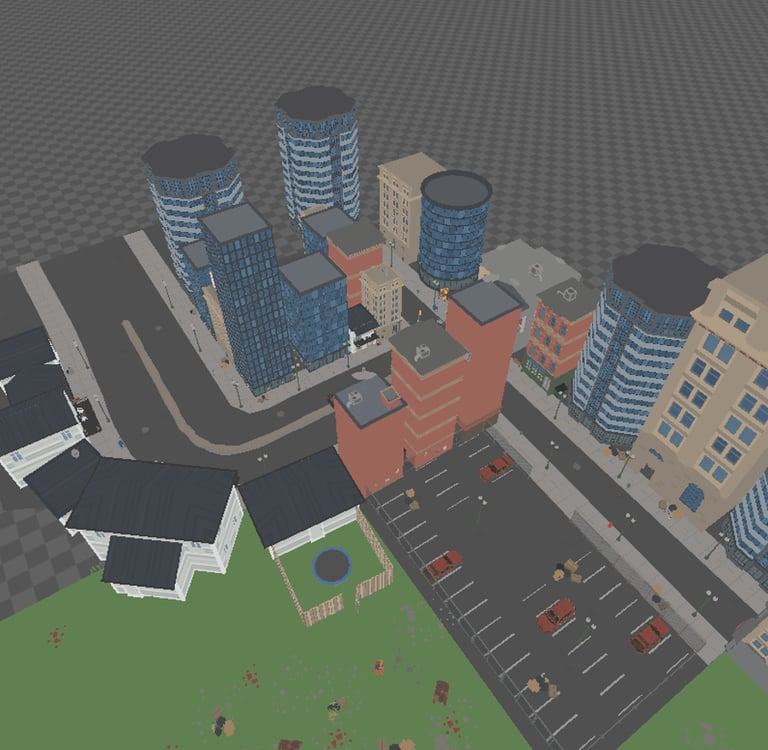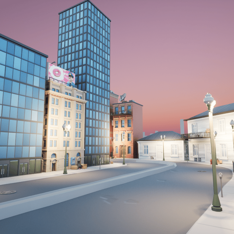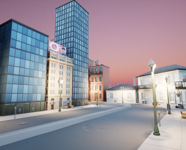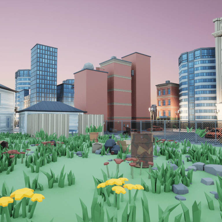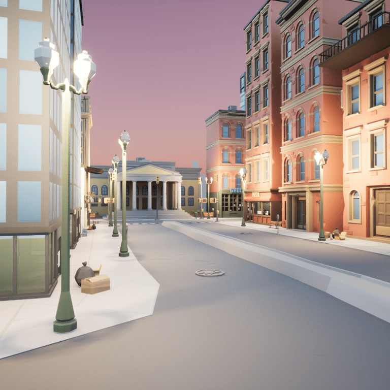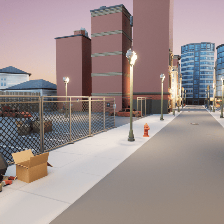 "The city of Suburbia was once a bustling thriving metropolis overflowing with wealth and opportunity. Companies would flock to Suburbia because of the younger population and the city's ideal location. Main street especially was a bustling area with both industry and residential areas side by side. As the city expanded a lot of the houses there became condos with a few houses still standing. One stubborn resident still has their house standing in between the office buildings. They refused to give up the land so it becomes a sort of tourist attraction to visitors because of its stark contrast with the industrial area. After some time, however, the city slowly started becoming less cared for. The decline of new business and lack of city funding caused the city to lose its shine. The backyards and alleys became filled with trash and the city itself fell into a state of disrepair. The city now is a less shiny version of itself, while the main street is still bustling with businesses it has severely decreased and is a shadow of its former self."